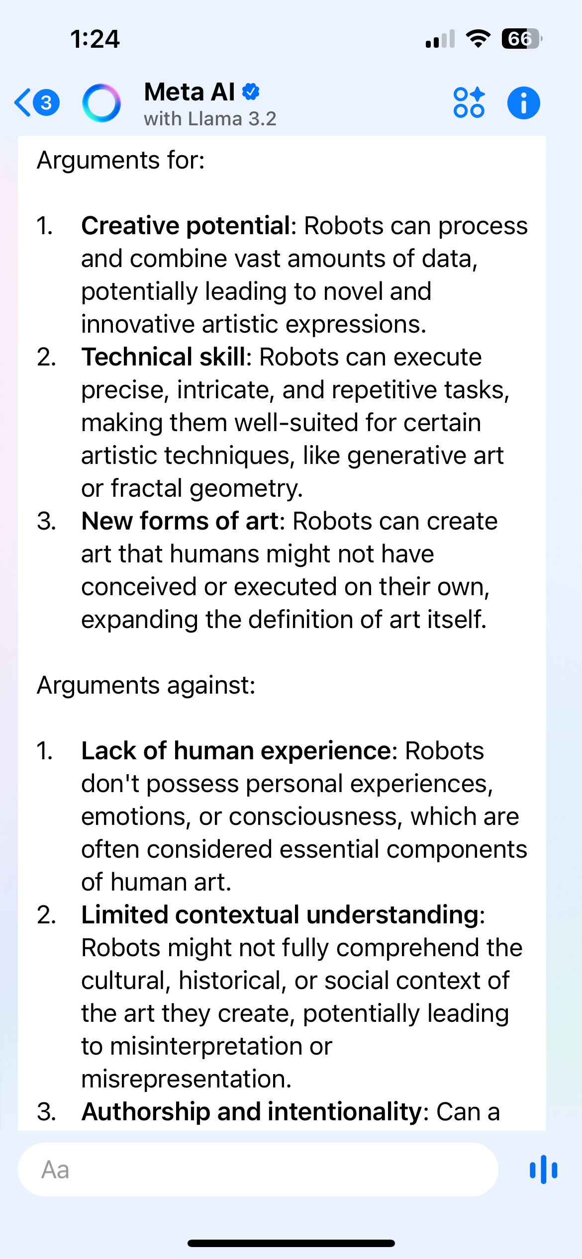 As part of my collaboration with the agents, I had some interesting conversations with them about whether they thought agents or robots could create art. We discussed not only whether they could create “art,” but also whether they would replace human artists. Check out some of the discussions below. What do you think?